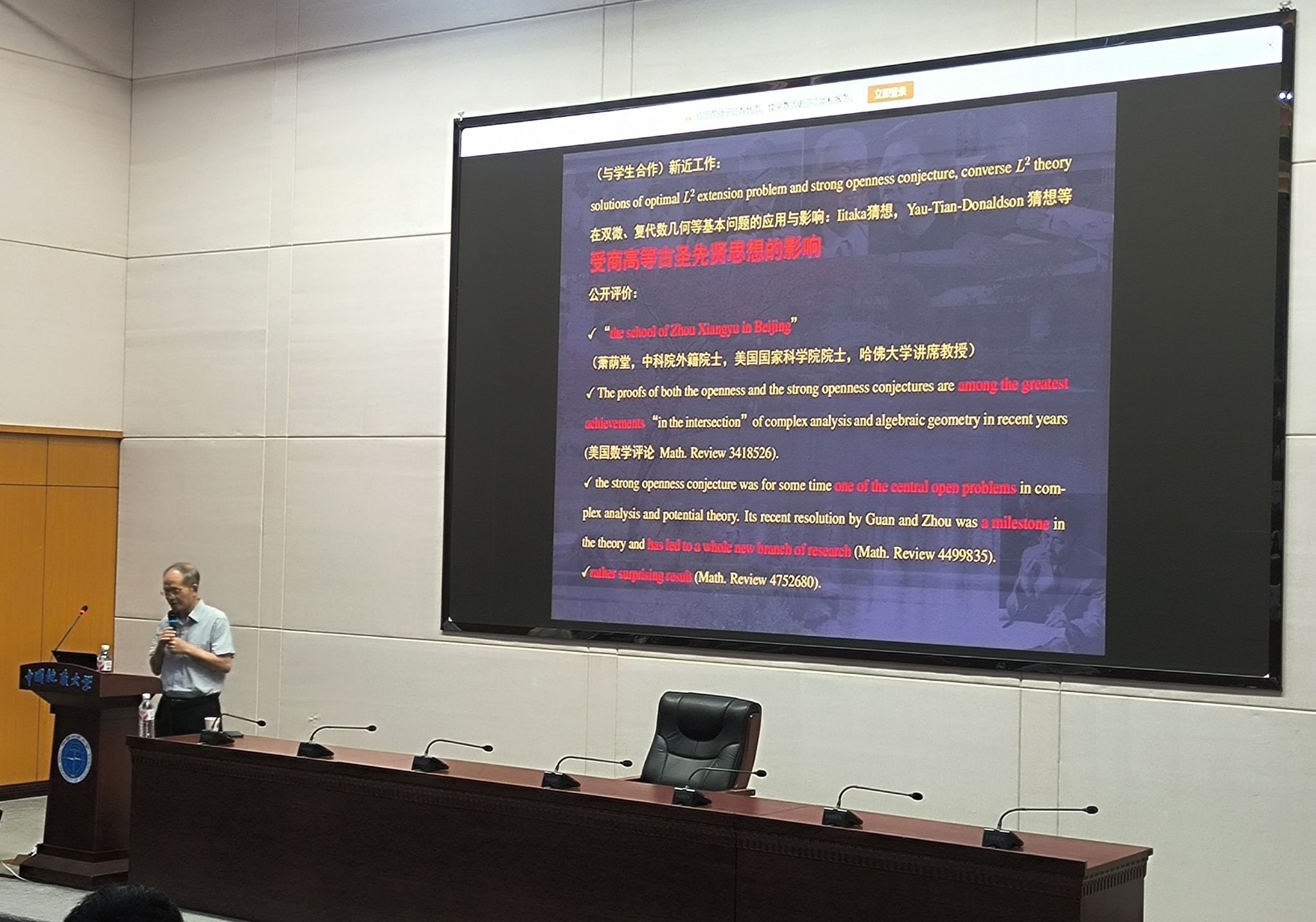 讲座尾声,周院士简要介绍了古代数学在多个现代数学分支中的影响与贡献,鼓励在场师生学习我国先贤的钻研求索精神,同时也简单介绍了其团队在多复变函数论领域取得的最新研究进展,以及在复代数几何、复微分几何等相关领域产生的应用价值与学术影响,指出与商高等古圣先贤思想也可互相印证,让师生们对中国古代数学中所蕴含的独特智慧、以及和前沿数学研究的联系有了更为直观的认识。