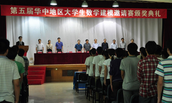 下午2:00颁奖典礼在响亮的国歌声中拉开序幕。第一项,主持人向观众介绍了到场嘉宾及第五届华中地区大学生数学建模邀请赛的比赛情况。本届邀请赛接受到的报名参赛队伍共有1280支,其中涉及21个省、市、自治区,55所高校,4000多名在校大学生。第二项由中国地质大学(武汉)副校长赖旭龙致开幕词,他首先对获得此次竞赛奖项的同学表示祝贺,并鼓励大家积极参赛。接下来便是向一、二、三等奖的获奖同学代表颁奖。各位领奖代表、颁奖嘉宾拍照留念,场面气氛十分活跃。颁奖典礼第四项是由中国地质大学(武汉)党委研工部部长喻芒清为91短视频