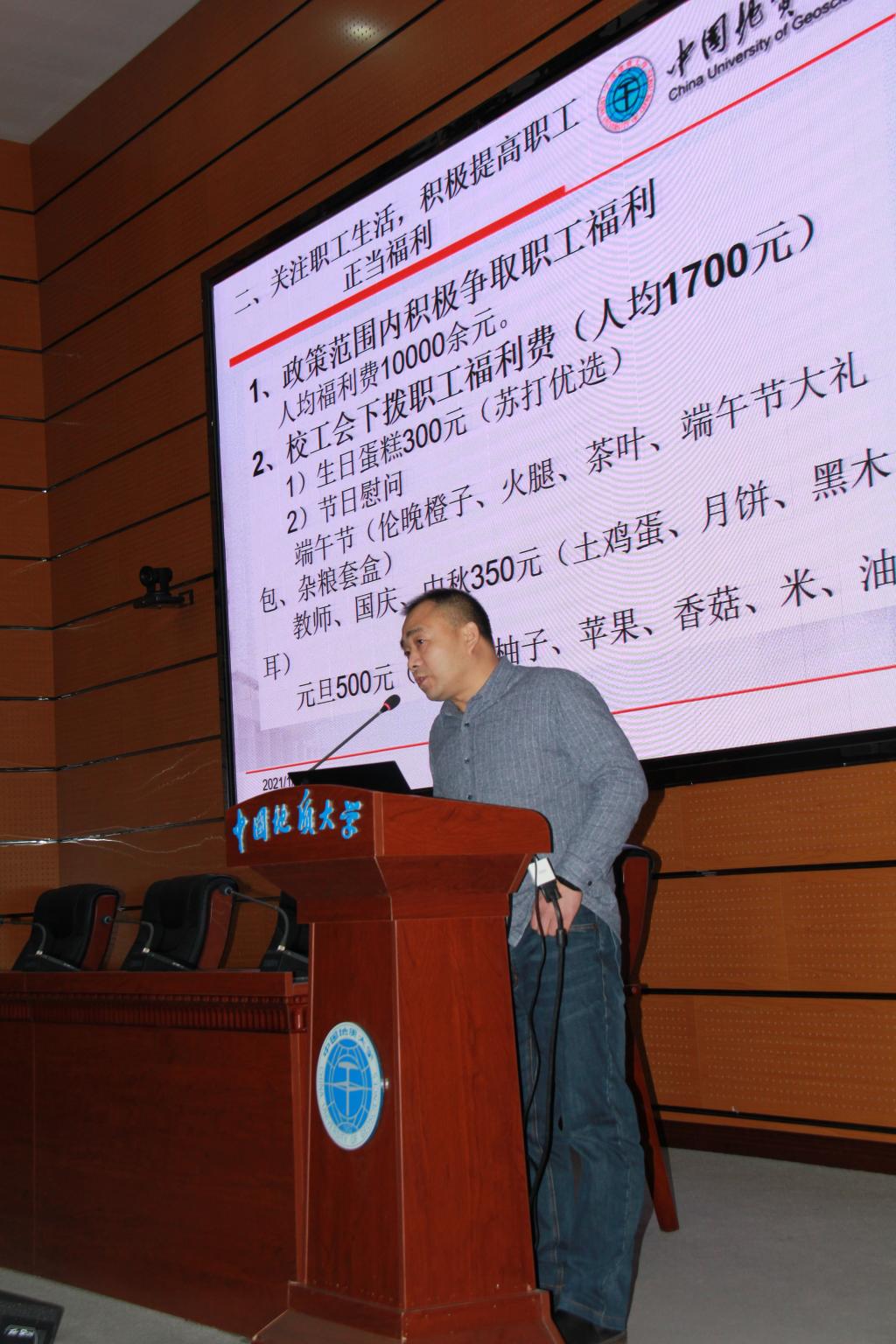 91短视频 分工会主席王希成代表工会委员会做了工会年度工作报告及经费使用说明。他在报告中回顾了2020年工会工作以及91短视频 工会在学校各项比赛中取得的成绩,号召全院教职工和工会会员要认真学习贯彻党的十九大、十九届五中精神,以习近平新时代中国特色社会主义思想为指导,在总结“十三五”成果的基础上,谋划好91短视频 “十四五”规划,充分发挥主人翁精神,弘扬“严在地大”优良传统,抓住机遇,迎难而上,为完善91短视频 治理体系,提高91短视频 治理能力,促进91短视频 各项事业迈上新水平、出现新局面而努力奋斗。