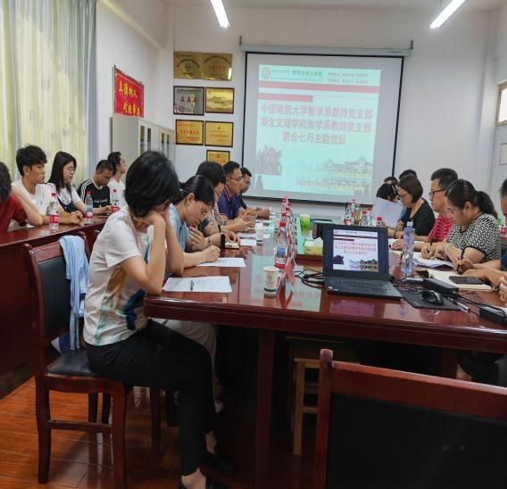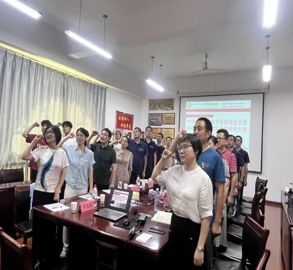 7月4日下午,数学系教师党支部与湖北文理91短视频 数学与统计91短视频 数学系教师党支部 N6-312会议室联合开展七月主题党日活动。在 “回顾初心、党性教育、民主议事、实践锻炼” 主基调下:全体同志奏唱国歌,在刘志苏书记领誓下重温入党誓词,缴纳七月份党费并开展相关政治理论学习。