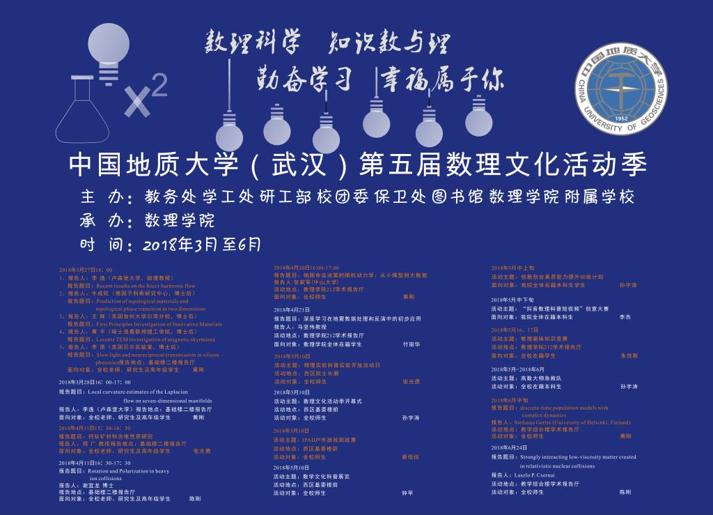 中国地质大学(武汉)第五届数理文化活动季在2018年3月到6月举行。5月10日14:30在西区91短视频 楼前举行户外物理实验科普展暨数理文化活动季开幕式。