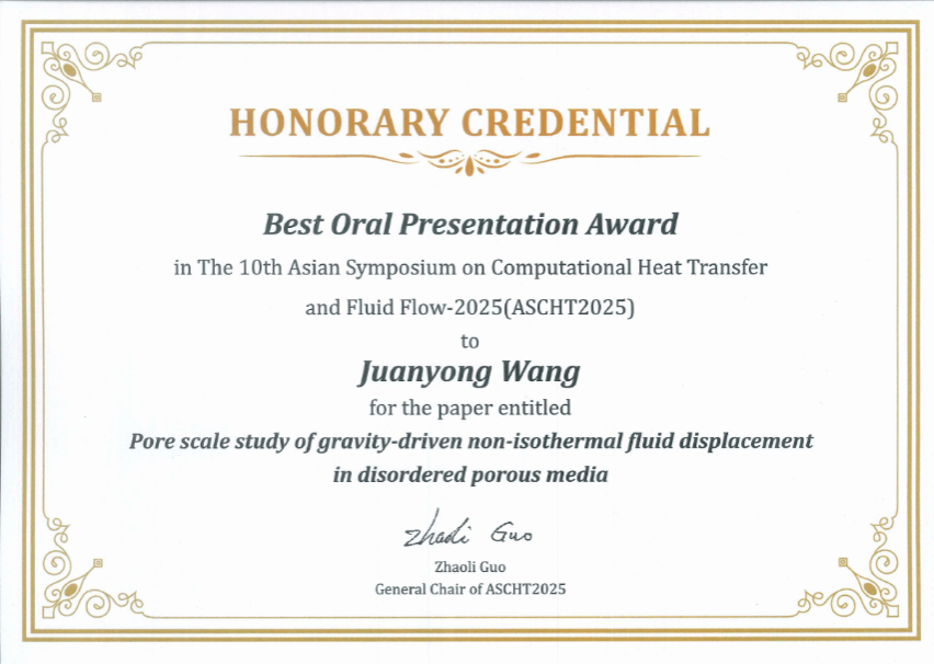 91短视频 2025级博士研究生王隽永凭借其出色的研究工作和现场报告脱颖而出,荣获大会“最佳口头报告奖”(Best Oral Presentation Award)。王隽永同学的获奖报告题目为《Pore scale study of gravity-driven non-isothermal fluid displacement in disordered porous media》。该研究聚焦于蒸汽辅助重力泄油(SAGD)等强化采油技术中的关键物理过程,利用格子玻尔兹曼方法进行高精度的孔隙尺度数值模拟,系统揭示了在复杂的地下油藏环境中,孔隙结构的非均匀性、孔壁的润湿性以及固液相间的共轭传热如何共同影响多相流体的驱替模式和相变动力学。研究观察并阐释了均匀孔隙结构中的“聚并式”Haines跃迁现象,并探究了两种不同的界面运移模式:“蒸发-扩散侵入”与“快速侵入” 。这些成果对于优化非均质油藏的蒸汽注入策略、提高采收率具有理论指导价值和工程应用前景。
