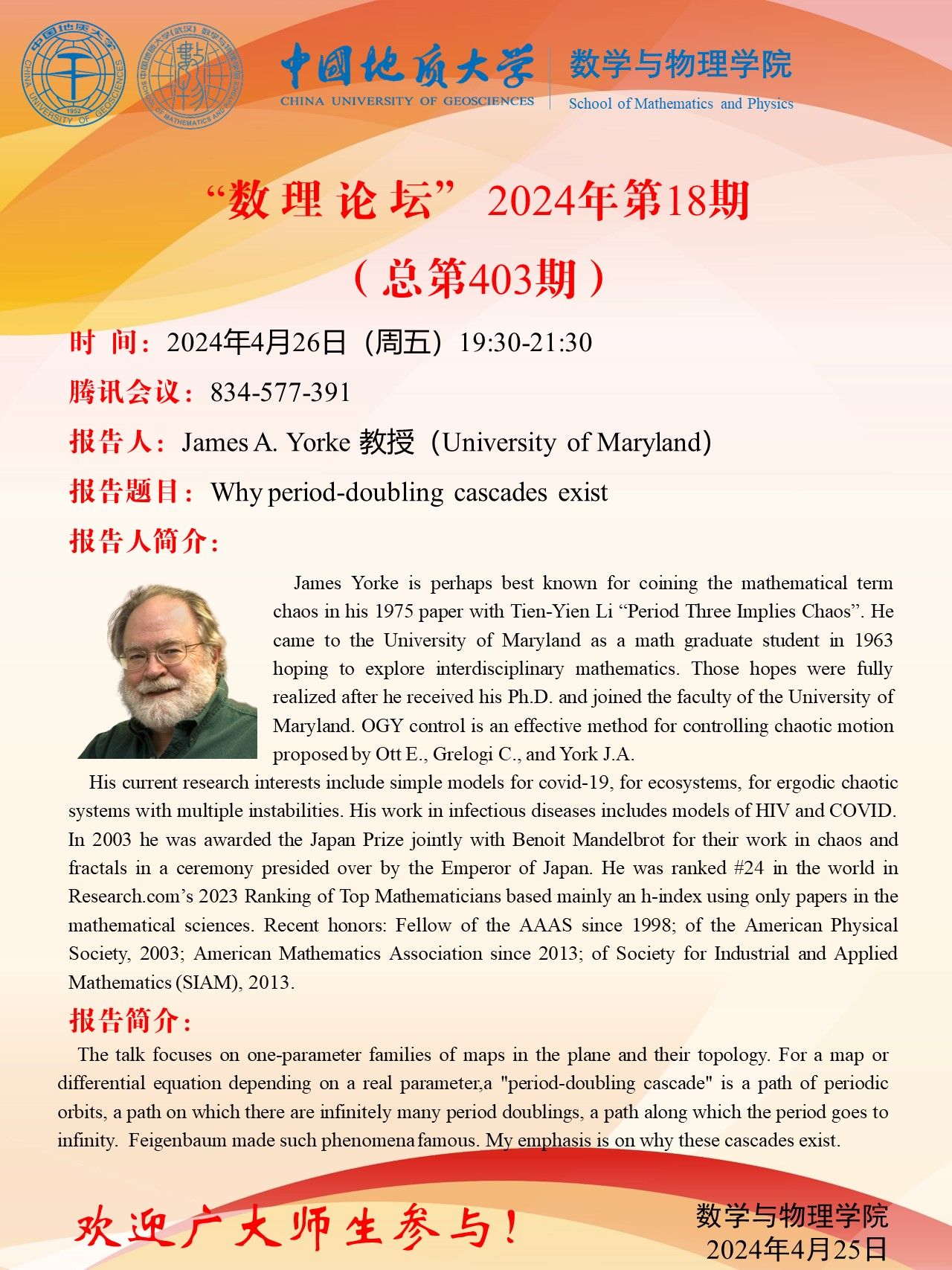 2024年4月26日James A. Yorke教授学术讲座:Why period-doubling cascades exist