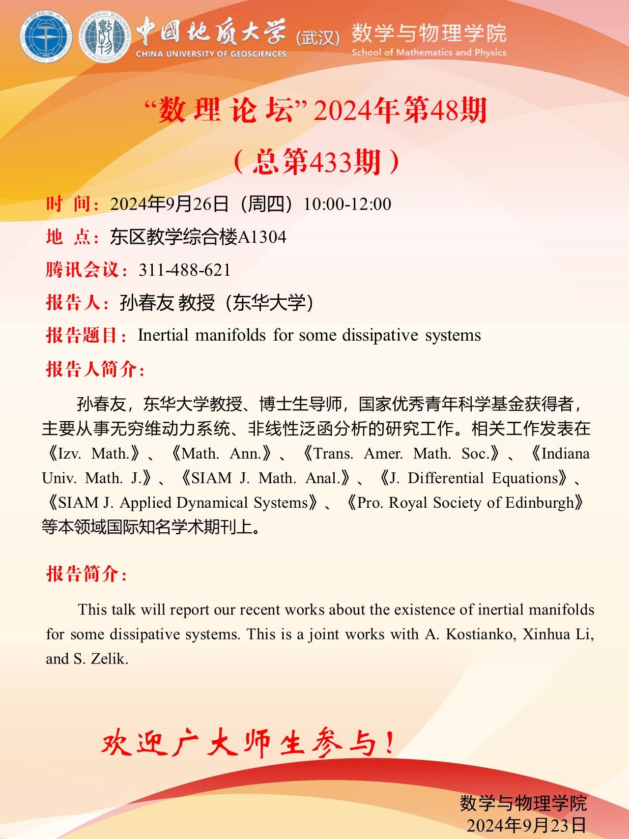 2024年9月26日孙春友教授学术讲座:Inertial manifolds for some dissipative systems