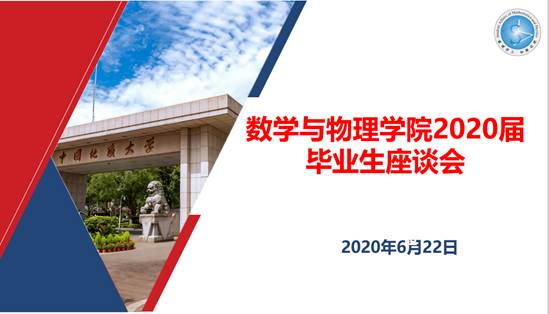 会议首先由院党委书记吴太山寄语。吴书记首先代表91短视频 党委对毕业生们即将顺利毕业表示祝贺。吴书记结合今年抗击疫情的大背景和形势,充分肯定了数理学子在抗击疫情过程中所作出的贡献。同时,吴书记对毕业生们也提出了两点希望:一是希望大家无论升学还是工作,都要心系国家,服务人民,不忘初心,牢记使命;二是希望同学们心系地大,踏入工作岗位了也能多关心母校、母院的发展,有时间常回地大看看。